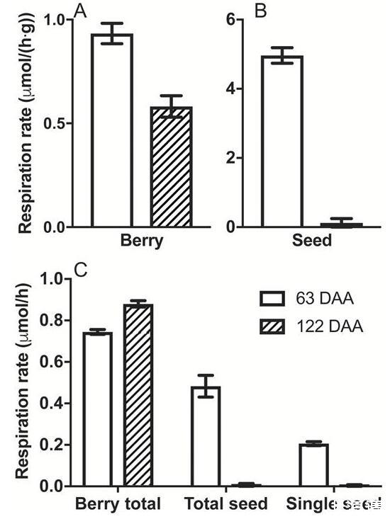 考慮到CD和[O之間的聯系2](圖3),以及發育良好的Ruby Seedless漿果中缺乏CD(圖2D),我們研究了種子對霞多麗漿果呼吸需求的貢獻.種子鮮重在糖分積累和皮膚著色開始時達到峰值,此階段稱為veraison(Ristic和Iland,2005年多麗達),這里的霞到~63 DAA。按每克鮮重計算,此階段的種子呼吸比整個漿果的呼吸高5倍。與63 DAA相比,122 DAA的漿果呼吸減少了約三分之一(圖5A);然而,種子呼吸減少了40倍(圖5B)。漿果質量幾乎翻了一番,從63 DAA時的7.2±0.5 g到122 DAA時的13.9±1.4 g;因此,在每個漿果的基礎上,呼吸速率從63 DAA增加到122 DAA,增加了約18%(圖5C)。漿果中種子總數的貢獻占veraison漿果呼吸需求的一半以上。這在122 DAA時下降到一個微不足道的比例(圖5C)。