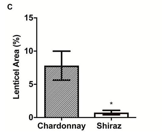 霞多麗(A)和設拉子(B)漿果花梗之間皮孔形態和相對皮孔面積的差異。(C)相對于霞多麗和設拉子漿果(室內種植,2015年)的花梗表面積,使用ImageJ估計的扁豆面積。(A)和(B)中的比例尺=1 mm。(C)中的數據是平均值±SE,n=5,*顯著不同(t檢驗,P<0.05)。