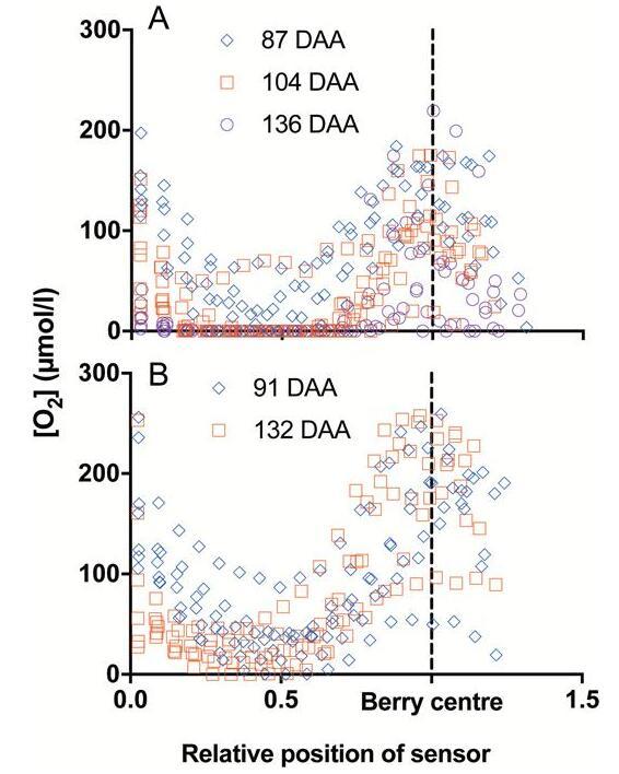 單個漿果[O 2]配置文件歸一化到漿果半徑。(A)[O 2 2015-2016季節在87、104和136 DAA采樣的霞多麗漿果的]分布(平均數據如圖所示圖2)。(B)[O 2 2016-2017季節在91和132 DAA下采樣的單個紅寶石無核漿果的]概況。