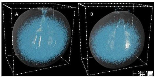 X射線顯微CT確定的霞多麗漿果中的空氣空間。(A)在98 DAA(19.3°Brix)和(B)在154 DAA(24.5°Brix)在2015-2016季節。圖像已被處理以指示漿果輪廓。最小體素截止值為500。框輪廓上的白點間隔1毫米。