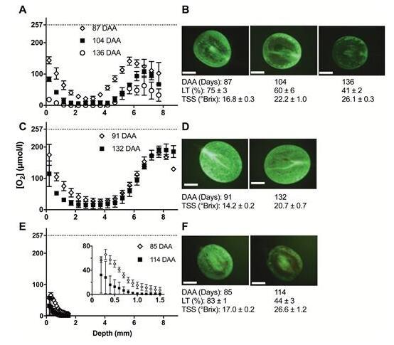 為了揭示CD的進展與漿果內缺氧之間是否存在聯系,我們使用FDA染色確定了CD,并記錄[O 2了同一天采樣的漿果的]剖面。類似的[O 2 Chardonnay和Ruby Seedless(中觀察到]分布圖2A、C)以及Shiraz在前1.5毫米(圖2E),但,[O 2隨著成熟的進行]在整個果皮上下降得更陡峭在所有品種中,導致整個[O總體較低2漿果的]。這表現為最低[O低得多2最后成熟階段采樣的]:霞多麗0μmol l–1、紅寶石無籽14.9±8.86μmol l–1和設拉子0μmol l–1。由于無法在設拉子漿果中看到種子,因此微型氧傳感器無法移入漿果中超過約1.6毫米,而不會危及傳感器的完整性(圖2E)。然而,很明顯,[O 2]急劇下降到1毫米(圖2E)。
