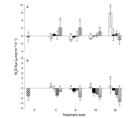 2. 當巖心被 (a) 淹沒和 (b) 暴露在空氣中時,來自營養實驗處理的 N2O 通量。 硝酸鹽(白條)、銨(黑條)、溶解無機氮(DIN;灰色條)和溶解無機氮加無機磷 (DIN DIP) 添加量(陰影條)的通量均在環境 (0) 下顯示為以及環境濃度的 4、8、16 和 32 倍。 大寫和小寫字母分別表示硝酸鹽和 DIN DIP 添加的 Tukey 測試結果。 對于所有處理,N2O 通量與處理水平沒有顯著差異( P< 0.05)。 所有通量都與相同的環境處理核心進行了比較(粗陰影),誤差線表示 6SE。 淹沒的通量顯著高于暴露的通量( P ? 0.0019)。