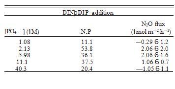 表 2. 每種處理的養分處理濃度、溶解無機氮 (DIN) 與溶解無機磷 (DIN DIP) 的比率,以及每個實驗處理和處理水平下淹沒核心的 N2O 通量。