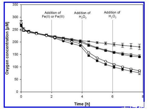 圖1. 添加芬頓試劑對 26°C 下貯藏啤酒耗氧的影響。在所示時間點,用針頭和注射器穿過橡膠隔墊添加試劑。曲線是典型實驗的代表,顯示了三次獨立實驗的平均值 ± 標準偏差。