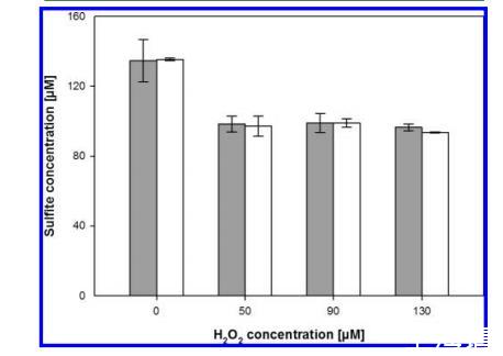 圖5. 在存在和不存在添加的3.6 μM Fe(II) 的情況下,添加遞增濃度的 H2O2 對 26°C 下孵育15分鐘后啤酒中亞硫酸鹽濃度的影響。誤差線表示來自至少兩個獨立實驗的標準偏差。