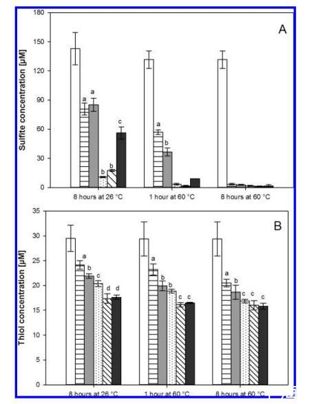 圖6. (A)亞硫酸鹽和(B)硫醇濃度,啤酒在不同條件下孵育:(1)在 26°C 下8小時,無添加物;(2)在 26°C 下8小時,添加36 μM Fe(II);(3)在 26°C 下1小時,添加180 μM H2O2;(4)在 26°C 下1小時,添加3.6 μM Fe(II) 和180 μM H2O2;(5)在 26°C 下1小時,添加36 μM Fe(II) 和180 μM H2O2;(6)在 60°C 下1小時,無添加物;(7)在 60°C 下8小時,無添加物。誤差線表示來自至少兩個獨立實驗的標準偏差。不同字母表示在p<0.05水平上顯著不同。