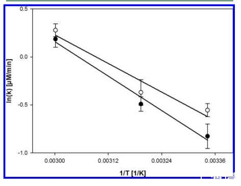 圖2. 貯藏啤酒在 26°C、40°C 和 60°C 下有(實心方塊)和沒有(空心圓圈)添加3.6 μM Fe(II) 時的耗氧速率自然對數與絕對溫度倒數(1000×T-1)的Arrhenius圖。誤差線表示來自兩次獨立實驗的標準偏差。直線表示數據的線性回歸。