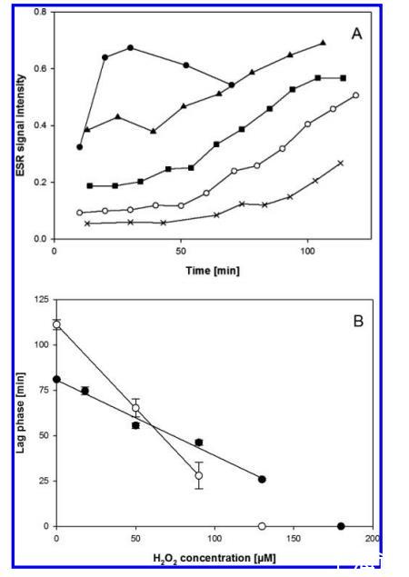 圖4. (A) 在存在(實心符號)和不存在(空心符號)添加的3.6 μM Fe(II) 的情況下,添加遞增濃度的 H2O2 對ESR信號初始強度和滯后期的影響。誤差線表示來自至少兩個獨立實驗的標準偏差。(B) ESR滯后期對 H2O2 濃度的線性依賴,在存在(實心方塊)和不存在(空心圓圈)添加的3.6 μM Fe(II) 的情況下。誤差線表示來自至少兩個獨立實驗的標準偏差。