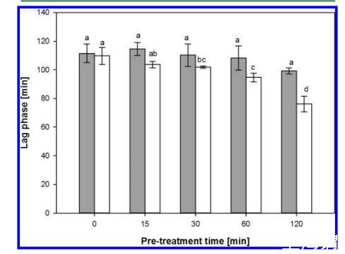 圖3. 在 50°C(空心符號)和 60°C(實心符號)下預熱0、15、30、60和120分鐘對啤酒ESR滯后期的影響。誤差線表示兩次測量(n=2)的標準偏差,當大于符號時可見。不同字母表示在p<0.05水平上顯著不同。