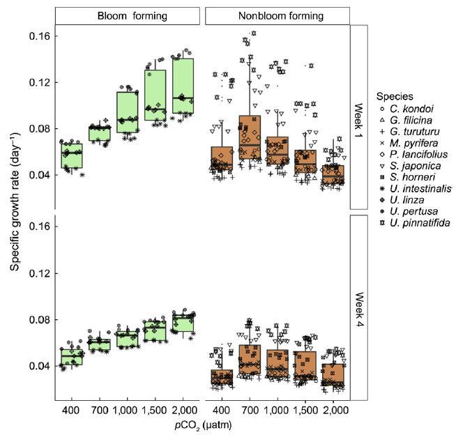 圖 2 生長響應曲線 成花(淡綠色)和非成花 (淺棕色)物種響應 在開始時升高 pCO2(一周 1,上圖)和結束(第 4 周,下圖) 面板)的室內潛伏期 中觀。 就像在實驗室里 治療,生長率響應 成花過程中 pCO2 水平升高 物種(雖然增加 增長不像過去那樣呈指數增長 實驗室環境),而非開花 物種表現出單峰 響應,增長達到峰值 700 和 1,000 latm pCO2 (F2,30 = 64.84, p < .0001)。 增長率下降 對所有場景中的所有物種都有顯著影響。 箱線圖按標準顯示,帶有 中位數作為粗體帶,和胡須 擴展到第一個四分位距。 覆蓋箱線圖的形狀表明 單個物種,每個物種的 n 為 每個 pCO2 水平 = 6。 [顏色數字可以 在 wileyonlinelibrary.com 上查看]