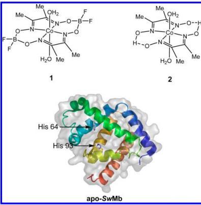 圖 1. 用于本研究的鈷肟配合物和抹香鯨肌紅蛋白(SwMb)的表示。蛋白質(zhì)的帶狀圖(PDB ID: 1UPD)顯示了血紅素結(jié)合口袋中的兩個(gè)組氨酸殘基(His64 和 His93)。