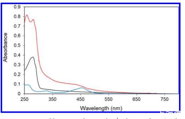 圖 2. (a)SwMb·1(黑色)、脫輔基-SwMb(藍色)和配合物 1(紅色)在 50 mmol L-1 Tris-HCl(pH 7.0)緩沖液中的紫外-可見光譜。(b)SwMb·1 在 300 到 600 nm 范圍內的光譜細節。所有光譜在相同條件下記錄,蛋白質濃度為 0.1 mmol L-1,1 的濃度為 0.1 mmol L-1。