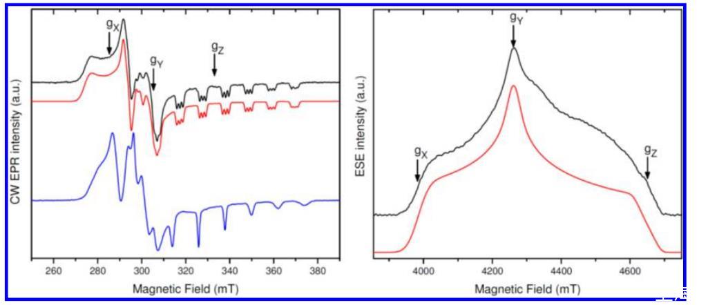 圖 5. (a)SwMb·1 在 50 mmol L-1 Tris-HCl(pH 7.0)緩沖液中的連續波 X 波段 EPR 光譜(黑色)及其模擬(紅色)。(b)SwMb·1 在相同緩沖液中的脈沖 D 波段 EPR 光譜(黑色)及其模擬(紅色)。(c)配合物 1 在甲醇中的連續波 X 波段 EPR 光譜(藍色)作為比較。所有光譜在 80 K 下記錄。SwMb·1 的模擬參數在表 1 中給出。