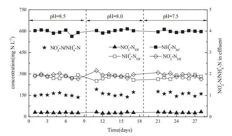 在每個 pH 值下,反應器至少運行一周。在初始 pH 范圍 7.5-8.5 內,pH 的變化對部分亞硝化幾乎沒有影響。進水 NH4+ 濃度為 598±12 mg N L-1,SBR 將大約一半的 NH4+-N 轉化為 NO2--N。出水中 NH4+ 和 NO2- 的濃度分別為 283±16 和 297±22 mg N L-1。出水中 NO2- 與 NH4+ 的摩爾比為 1.05±0.12,這適合作為厭氧氨氧化過程的進水。出水中的 NO3- 濃度為 28.40±2.46 mg N L-1,表明亞硝酸鹽氧化細菌的活性較低。