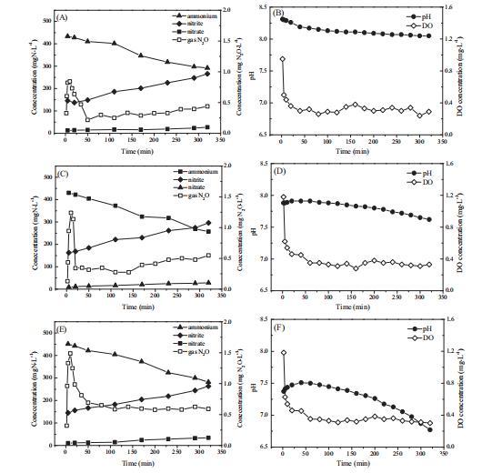 圖3. 不同pH水平下部分亞硝化循環過程中氮和工藝參數的變化(A和B對應初始pH為8.5,C和D對應初始pH為8.0,E和F對應初始pH為7.5)