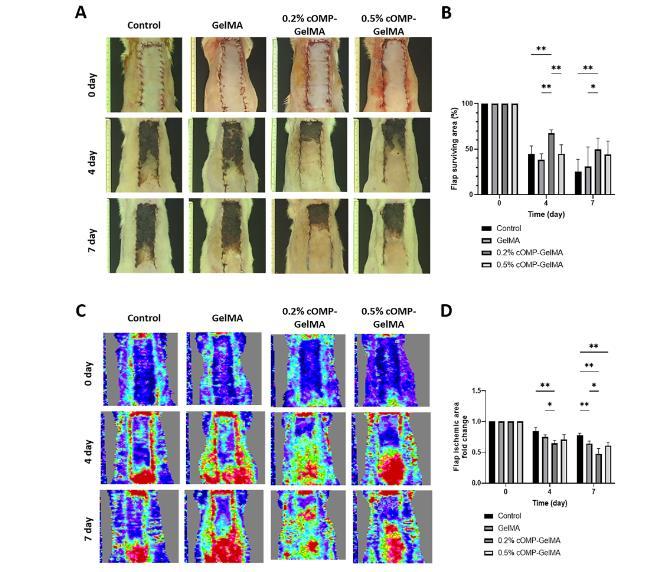 圖4、cOMP-GelMA 治療對隨機模式皮瓣模型中皮瓣存活情況及血流的影響。(A)代表性數字圖像顯示了術后不同治療組在第 0、4 和 7 天皮瓣壞死的進展情況。(B)皮瓣存活率的圖形量化表示,以術后第 0、4 和 7 天存活的皮瓣面積百分比形式呈現(每組 n = 5)。(C)代表性的激光多普勒血流(LDBF)圖像描繪了術后第 0、4 和 7 天皮瓣血流的變化。LDBF 指數用顏色編碼,紅色表示高灌注,藍色表示低灌注。(D)術后第 0、4 和 7 天血流變化的定量分析,以相對于第 0 天缺血區域的倍數變化形式表示(每組 n = 5)。數據以平均值±標準差的形式呈現。統計顯著性通過兩因素方差分析確定。