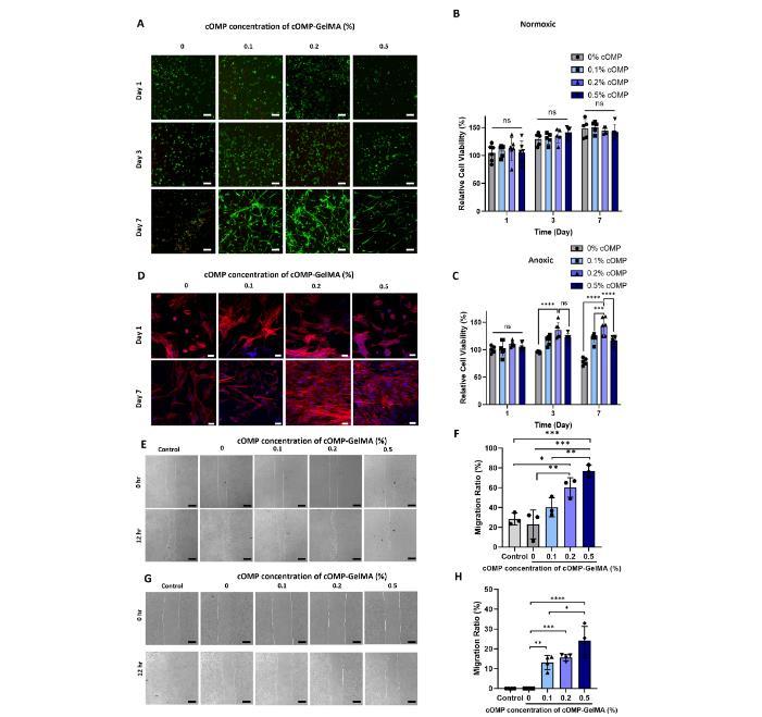 圖3、對 cOMP-GelMA 的體外特性分析:(A)在無氧條件下(氧氣含量為 0.1%)培養 1 天、3 天和 7 天后,被 cOMP-GelMA 包裹的成纖維細胞的活/死熒光顯微圖像(比例尺:200 微米)。在(B)常氧條件下和(C)無氧條件下培養 1 天、3 天和 7 天后,被 cOMP-GelMA 包裹的成纖維細胞的相對細胞存活率(n = 6)。(D)在無氧條件下培養 1 天和 7 天后,cOMP-GelMA 表面的成纖維細胞的 F-肌動蛋白染色共聚焦圖像(比例尺:50 微米)。(E)在無氧條件下(氧氣含量為 0.1%)培養 12 小時后,cOMP-GelMA 在無氧條件下的遷移圖像。(F)成纖維細胞遷移率圖(n = 3)。(G)在無氧條件下(氧氣含量為 0.5%)培養 12 小時后,cOMP-GelMA 在無氧條件下的 HUVECs 遷移圖像。(H)HUVECs 的遷移率圖。數據以平均值±標準差的形式呈現。統計學意義通過單因素方差分析確定。