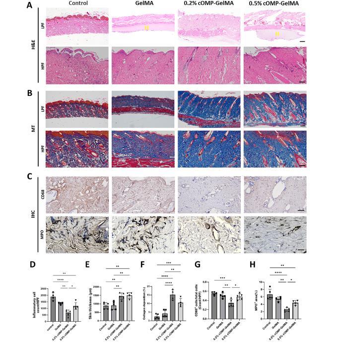 圖5、對使用 cOMP-GelMA 處理的皮膚瓣進行的比較組織學和免疫組織化學評估。(A、B)皮膚瓣切片的代表性顯微照片,分別用(A)蘇木精-伊紅(H&E)染色和(B)馬松三色染色(MT)染色。H&E 和 MT 切片均在低倍視野(LPF,上行列)和高倍視野(HPF,下行列)中展示。(C)免疫組織化學(IHC)圖像顯示真皮中的 CD68 和 MPO 表達。(D)用 H&E 染色切片定量炎癥細胞計數。(E)從 H&E 染色切片測量皮膚厚度。(F)用 MT 染色切片定量膠原蛋白沉積。(G、H)真皮中 CD68 陽性巨噬細胞(G)和 MPO 陽性染色(H)的定量。