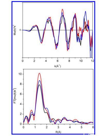 圖7.(頂部)SwMb·1(黑色)、SwMb·2(藍色)和配合物1(綠色)的k3加權EXAFS光譜。(底部)相應的傅里葉變換幅度。所有光譜在20K下記錄。