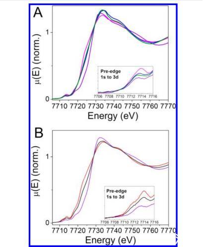 然而,在1的低溫數據中沒有第二個前吸收邊特征的跡象,表明1(3d7)在20K時具有低自旋態,只有一組空且幾乎等能的3d軌道。這種依賴于溫度的自旋態形成在鐵物種中常見。更高的前吸收邊強度也表明1中存在一些3d-4p混合,但生物雜交物中的這種混合減少,這可能是因為當鈷(II)和鈷(III)物種結合到蛋白質基質時,都獲得了更對稱的配位球,很可能是八面體幾何結構。