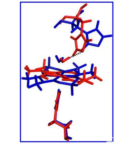最初使用MM能量函數進行對接計算,以確定{Co(dmgBF2)2}和{Co(dmgH)2}部分在SwMb腔內可能的容納情況。His93與兩個部分的鈷中心的配位明顯比與腔內存在的其他組氨酸(His64)殘基的配位更穩定。根據此模型,一個軸向水分子在His93的反位配位,并使用QC/MM勢能優化系統,QC區域包含鈷配合物和配位組氨酸的側鏈。圖8顯示了兩種生物雜交物中圍繞金屬中心的優化結構的疊加。這些結構的其他表示顯示在圖9。