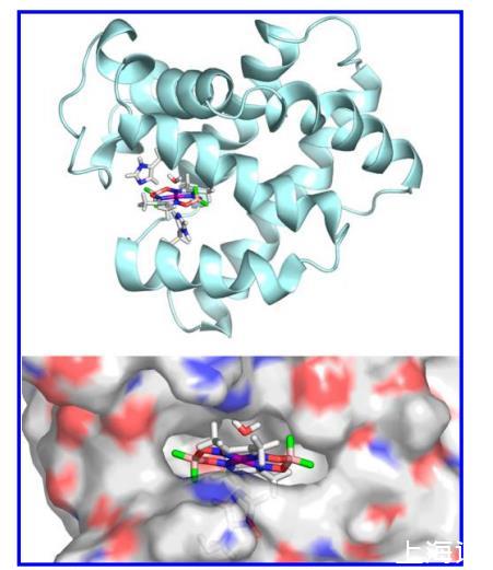 圖8.SwMb·1({Co(dmgBF2)2}部分,綠色)和SwMb·2({Co(dmgH)2}部分,紫色)生物雜交物中鈷配合物結合位點的疊加。來自多肽鏈,僅表示了His93(底部)和His64(頂部)。