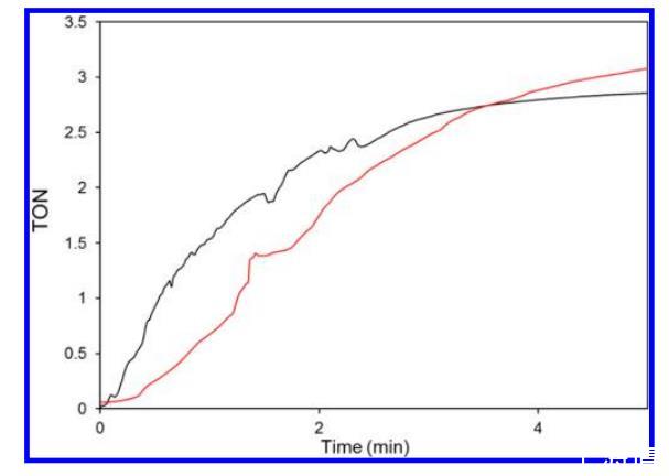 圖11.在25°C下,pH7.0的50mmolL-1Tris-HCl緩沖液中,通過添加10當(dāng)量[Eu(EGTA)(H2O)]2-引發(fā)的,由SwMb·2(藍色)和配合物2(紅色)催化的H2釋放時間進程。催化劑濃度為0.01mmolL-1。