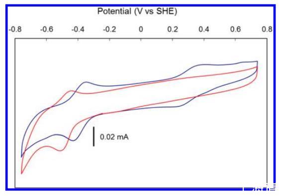 固定在MWCNTs上的SwMb·1在Tris-HCl(pH7.5)緩沖液中記錄的循環(huán)伏安圖(圖10)顯示了一個在-0.48VvsSHE的可逆體系,可歸屬于容納在SwMb中的配合物1的鈷(II)/鈷(I)電對。在相同MWCNT電極上記錄的1的毫摩爾溶液的循環(huán)伏安圖(圖10)顯示了一個在-0.38VvsSHE的可逆信號;即,SwMb·1中的鈷(II)/鈷(I)電對位于比1在相同MWCNT電極上負(fù)100mV的位置。它顯示了一個定義不清且不可逆的信號,起始于-0.38VvsSHE,初步歸屬于{Co-(dmgH)2(H2O)His}部分的鈷(III)/鈷(II)電對。無法識別鈷(II)/鈷(I)的信號,因為它與一個大的、可能是催化的波重疊,起始于-0.6VvsSHE,歸屬于H2釋放。