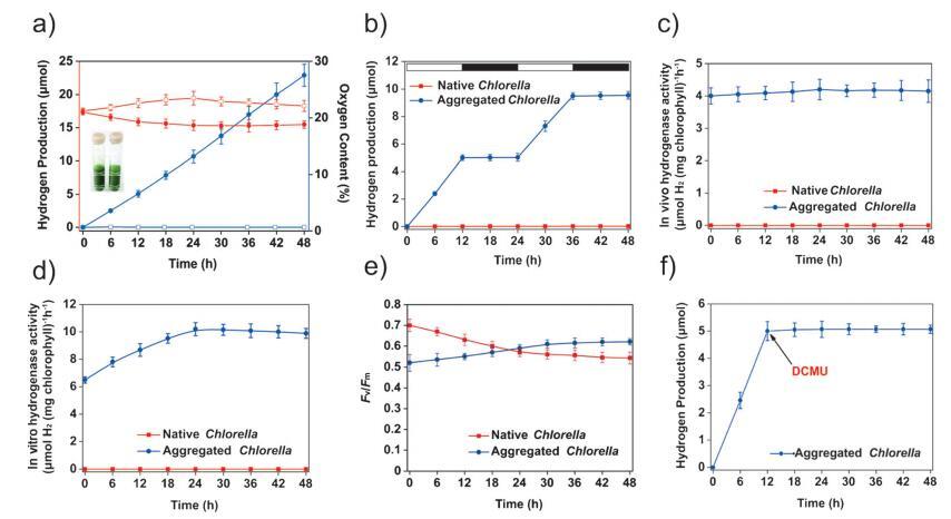 為了定量研究聚集的小球藻細胞中 H2 產(chǎn)生的特性,我們監(jiān)測了 H2 和 O2 在使用氣體的密閉玻璃管的頂部空間中 色譜法(圖 2a)。 含有小球藻 (1.2 × 108 細胞mL¢ 1 ) 加入 60 mL 光照下的密封玻璃管(100 mEm¢ 2 s¢ 1 )。 為了 原生小球藻,H2 無法檢測到頂空 在任何測量點,頂部空間中的 O2 含量從最初的 21% 增加到 23%。 結果表明,天然小球藻細胞進行光合 O2 進化,但不產(chǎn)生 H2,這是由于 在有氧條件下使氫化酶失活。 有趣的是,觀察到 100 毫米的聚集體以約 0.35 mmolH2h¢ 1 (mg葉綠素)¢ 1 (圖 2a;支撐 信息,圖 S6)。 這個比率是自然界瞬時生物質(zhì)燃料產(chǎn)量的 1.75 倍 (0.20 mmolH2h¢ 1 (mg 葉綠素)¢ 1 ).[14] 更重要的是, 這種 H2 的產(chǎn)生不僅限于 幾分鐘; 相反,這種生產(chǎn)被檢測到 至少 48 小時。 隨后,H2 的速率 生產(chǎn)開始減少(支持信息, 圖 S6),這可能是由于聚合受損 聚集體中細胞增殖產(chǎn)生的結構(支持信息,圖 S7)。 的生產(chǎn) 在聚合之前,H2 可以持續(xù)至少 60 小時 結構分解(支持信息,圖 S6 和 S7)。 與原生小球藻相比,我們注意到 O2 聚集體頂部空間的含量從 實驗期間為 21% 至 19%。 這種減少很可能 歸因于消耗 O2 分子的細胞呼吸 存在于封閉系統(tǒng)中。 在聚集的細胞中,O2 進化減少,因此 H2 產(chǎn)生 增加。 此外,在交替的時期 明暗(圖 2 b),我們發(fā)現(xiàn)聚集體僅 在光照期間產(chǎn)生 H2; 下未檢測到 H2 黑暗的條件。 這種明暗切換效應暗示著 H2 的產(chǎn)生與光合作用直接相關。