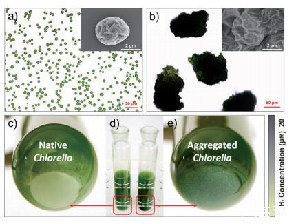 圖 1. 蛋白核小球藻細胞及其聚集體。 a) 本地人 使用光學顯微鏡和掃描電子觀察細胞 顯微鏡(SEM)。 比例尺:20 毫米(插圖:2 毫米)。 b) 聚合 使用光學顯微鏡和 SEM 觀察細胞。 比例尺: 50 毫米(插圖:2 毫米)。 c) 含有 WO3 的天然小球藻培養(yǎng)基 粉末(管的底部)。 d) 本地和聚合的小球藻培養(yǎng)物 管中裝有 WO3 粉末的介質(zhì)。 e) 聚合小球藻 含有 WO3 粉末的培養(yǎng)基(管底)。 酒吧 表示 WO3 的標準顏色變化 在 H2 存在下 在 解決方案。