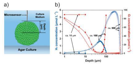 圖 3. 聚集小球藻的空間功能分化。 a) 微傳感器測量圖。 b) 氫氣 (藍色)和 O2 (紅色的) 不同大小的聚集小球藻的微觀結構 (n=5)。