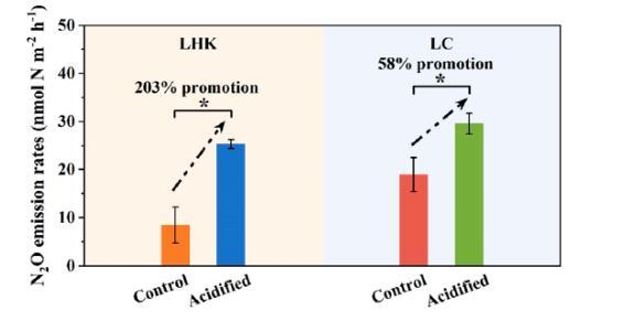 圖2、水體酸化對河口及沿海沉積物中 N2O 排放速率的影響。垂直條表示標準誤差(n = 3)。* 表示環境對照組與酸化處理組之間存在顯著差異。