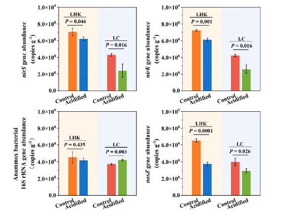 本研究通過模擬未來酸化情景(pH降低約0.3)的實驗表明,水生酸化對河口與沿海沉積物的氮循環產生了復雜而深刻的影響。首先它差異化地重塑了微生物氮移除格局:核心的氮移除過程——反硝化速率被顯著抑制了41%至53%,而厭氧氨氧化速率則被促進了47%至109%。由于反硝化仍占主導地位,導致生態系統的總氮移除能力被整體削弱了35%至47%。其次,酸化顯著加劇了溫室氣體排放風險:與反硝化速率下降形成對比,強效溫室氣體氧化亞氮(N?O)的排放速率卻大幅增加了49%至214%。分子機制分析表明,這很可能與負責還原N?O的nosZ功能基因豐度大幅降低有關。