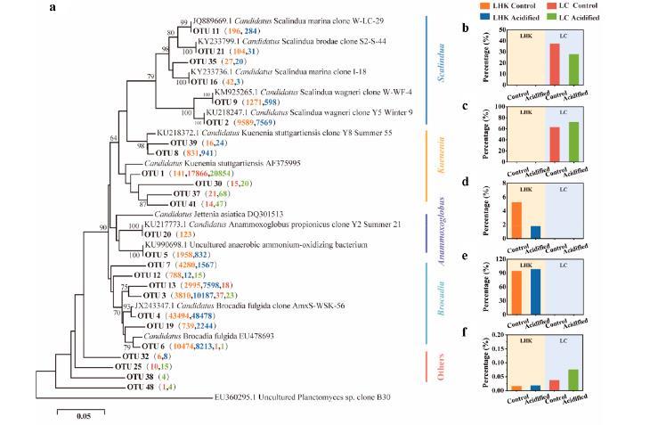 圖5、水體酸化對河口及沿海沉積物中厭氧氨氧化菌群落的影響。(a)基于厭氧氨氧化細菌 16S rRNA 基因序列構建的鄰接系統進化樹。(b - f)每個樣本中屬于斯卡林杜瓦屬、庫內尼亞屬、厭氧氨氧化球菌屬、布羅卡迪亞屬和其他類群的序列百分比分別如下。分支節點處顯示的置信度值超過 60%(1000 次重復)。比例尺表示每個位點的核苷酸替換次數。其他研究中序列的 GenBank 登錄號已標注。每個 OTU(加粗)后面括號中的數據表示序列編號。橙色:LHK 對照組;藍色:LHK 酸化組;紅色:LC 控制;綠色:LC 酸化狀態。