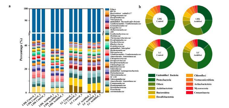 圖4、水體酸化對河口及沿海沉積物中微生物群落結構的影響。(a)在屬級別上的微生物分類。(b)在門級別上的微生物分類。