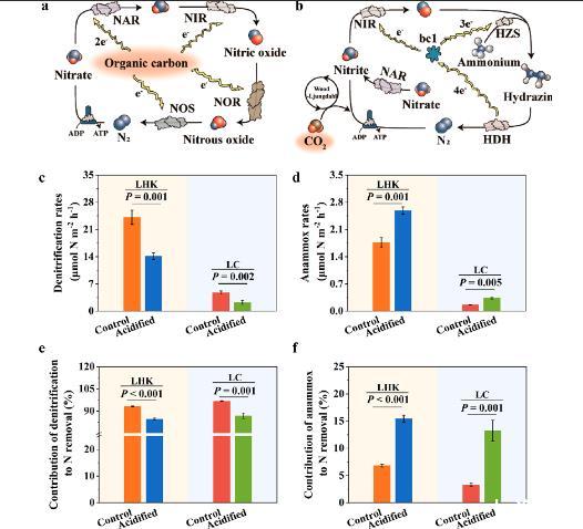 圖1、水體酸化對河口及沿海沉積物中氮去除速率的影響。(a)反硝化菌的生化途徑和酶系統,這些細菌需要有機碳源來進行呼吸和生長。56 (b)厭氧氨氧化菌的生化途徑和酶系統,這些細菌主要利用無機碳。22 (c)酸化對反硝化速率的影響。(d)酸化對厭氧氨氧化速率的影響。(e)酸化對反硝化對氮去除貢獻的影響。(f)酸化對厭氧氨氧化對氮去除貢獻的影響。NAR,硝酸還原酶;NIR,亞硝酸還原酶;NOR,一氧化氮還原酶;NOS,一氧化氮氧化酶;HZS,肼合成酶;HDH,肼脫氫酶。豎線表示標準誤差(n = 3)。P < 0.05 表示存在顯著差異。
