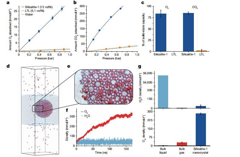圖3 | 平衡氣體吸附等溫線與分子動力學模擬。在25°C條件下,硅藻土-1納米晶體水溶液(海軍藍)中O2(a)和二氧化碳(b)的氣體吸收等溫線,以及沸石 LTL 納米晶體水溶液(橙色)中5.1 vol%的二氧化碳吸收等溫線。海軍藍和橙色線條代表等溫線數(shù)據(jù)的線性擬合結果,但硅藻土-1溶液中二氧化碳吸收的單一位點Langmuir–Freundlich擬合除外。純水在25°C下的O2和二氧化碳溶解度用淺藍色線條標示。誤差條表示純水對照實驗的標準偏差;需注意某些情況下誤差條小于數(shù)據(jù)點尺寸。c. 沸石納米晶體在水溶液中吸附的O2和二氧化碳量(通過考慮純水氣體溶解度得出),相對于沸石固態(tài)氣體容量。誤差條表示純水對照實驗的標準偏差。d. 用于分子動力學模擬的16.2×16.2×52 nm模擬箱圖像,其中初始填充有3,500個水分子的球形硅藻土-1納米晶體,周圍為體相水相和O2氣體分子頂空。模擬箱快照顯示系統(tǒng)在平衡狀態(tài)及內部水分子排出后的狀態(tài)。O原子以紅色顯示,H原子以白色顯示,Si原子以藍色顯示,而體相水相則表現(xiàn)為半透明的藍色體積。e、硅酸鹽-1納米晶體邊緣的放大視圖。f、模擬時間尺度內初始干燥的硅酸鹽-1納米晶體內部O2和水的密度變化。g、模擬最后50納秒期間體相液相、體相氣相及硅酸鹽-1納米晶體中水(上)與O2(下)的平均濃度。