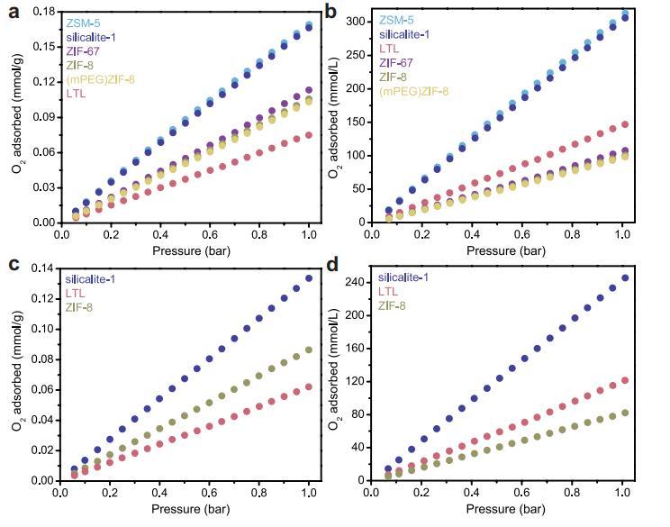 擴展數(shù)據(jù)圖4 | 固態(tài)等溫線。 O?吸附等溫線在25°C(a,b)和37°C(c,d)以重量和體積為基礎繪制。體積值使用晶體密度從重量值計算。與可及表面積一致,ZIF-8的共價功能化對O?吸附的影響可忽略不計,如ZIF-8和(mPEG)ZIF-8的等溫線比較所示。