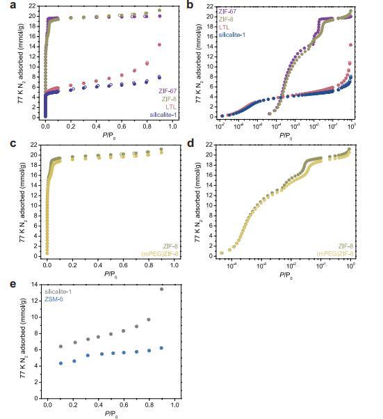 a. 合成的ZIF-67、ZIF-8、沸石LTL和silicalite-1在77K下的氮氣吸附(實心圓)和解吸(空心圓)等溫線(線性坐標)。b. 合成的ZIF-67、ZIF-8、沸石LTL和silicalite-1在77K下的氮氣吸附(實心圓)和解吸(空心圓)等溫線(對數(shù)坐標)。c. 功能化前后ZIF-8納米晶在77K下的氮氣吸附(實心圓)和解吸(空心圓)等溫線(線性坐標),顯示共價功能化對可及表面積影響極小。d. 功能化前后ZIF-8納米晶在77K下的氮氣吸附(實心圓)和解吸(空心圓)等溫線(對數(shù)坐標),顯示共價功能化對可及表面積影響極小。e. 60-nm silicalite-1和ZSM-5納米晶分散到水中前在77K下的氮氣吸附等溫線。通過t-plot法(擬合范圍3.5-9.8 ?)計算得到的60-nm silicalite-1的微孔體積為0.16 ml g?1,與90-nm silicalite-1的微孔體積一致(補充表4)。通過t-plot法(擬合范圍4.7-13 ?)計算得到的ZSM-5的微孔體積為0.17 ml g?1。