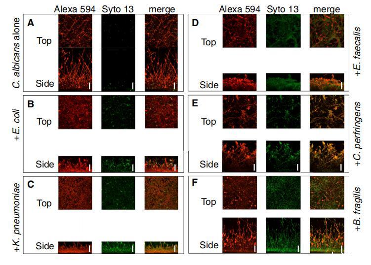 圖 1. 白色念珠菌與五個形成生物膜 體外不同種類的細菌 (A-F)白色念珠菌在生物膜中生長 24 小時 單獨使用 (A) 或與大腸桿菌 (B)、肺炎克雷伯菌一起使用 (C)、糞腸球菌 (D)、產(chǎn)氣莢膜梭菌 (E) 或脆弱擬桿菌 (F)。 生物膜用伴刀豆球蛋白 A 染色, Alexa 594 和 Syto 13 染料,然后由 中海法會。 圖像是最大強度投影 的頂視圖和側(cè)視圖。 代表圖像 至少顯示三個重復(fù)。 比例尺 代表 50 毫米。 另請參見圖 S1。