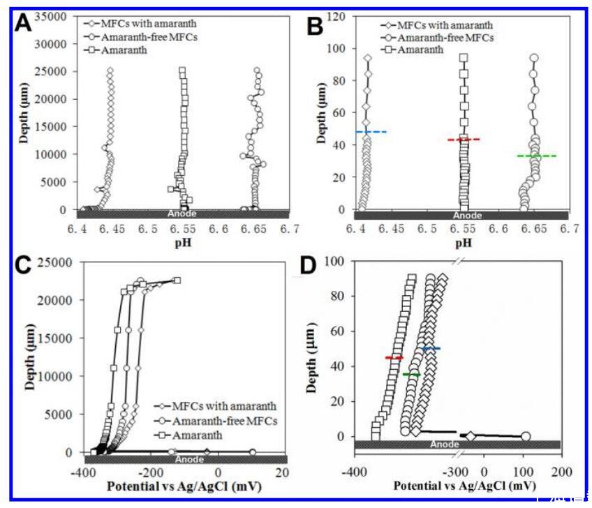 生物膜中的pH和氧化還原電位曲線(xiàn)。 用O2微電極進(jìn)行的測(cè)量證實(shí),在實(shí)驗(yàn)過(guò)程中,散裝液體是缺氧的(圖S5,支持信息)。 pH微電極測(cè)量(圖3A,B)表明,隨著細(xì)胞生長(zhǎng),體積液體pH值降低,即,含有莧菜紅的MFC(6.43)<NA反應(yīng)器(6.55)<無(wú)莧菜紅的MFC(6.65),表明謝瓦納菌細(xì)胞外呼吸期間分泌酸性代謝物。 由于細(xì)菌電極呼吸是一種質(zhì)子釋放反應(yīng),因此含莧菜紅的MFC中電流產(chǎn)生的更大增加也會(huì)降低pH值。 在無(wú)莧菜紅的MFC的生物膜中觀(guān)察到pH梯度下降(約0.02),這表明質(zhì)子在陽(yáng)極呼吸生物膜中的積累與之前的預(yù)測(cè)一致。35本研究中觀(guān)察到的pH梯度小于在其他陽(yáng)極呼吸生物膜中觀(guān)察到的pH梯度(0.08到1個(gè)單位), 17,36這可能是由于較薄的生物膜或Shewanella生物膜相對(duì)較高的擴(kuò)散效率。37與陽(yáng)極呼吸生物膜相比,分別與陽(yáng)極和莧菜呼吸或僅與莧菜呼吸時(shí),生物膜中的pH梯度降低或消失。 這是因?yàn)橘|(zhì)子可能被莧菜紅還原生成的萘胺所消耗。