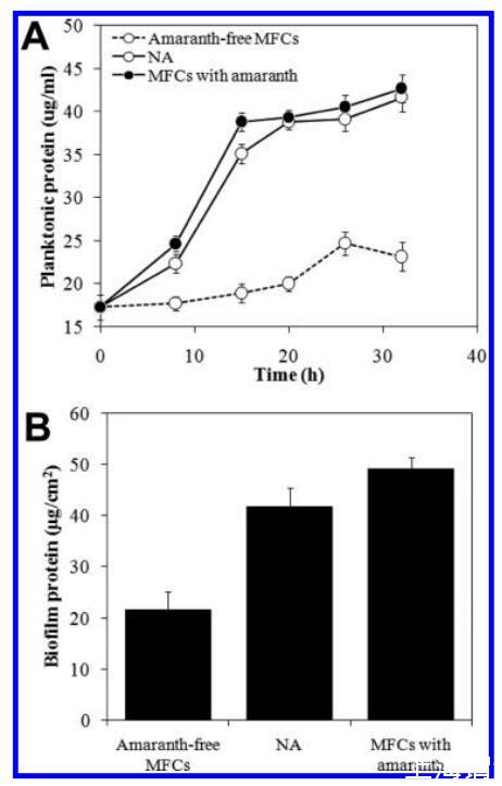浮游生物和生物膜細(xì)胞生長(zhǎng)。 含有莧菜紅的MFC中基于蛋白質(zhì)的浮游生物量約為無(wú)莧菜紅MFC的兩倍,但與具有相同莧菜紅濃度的NA反應(yīng)器中的浮游生物量無(wú)顯著差異(圖2A)。 結(jié)果表明,陽(yáng)極呼吸對(duì)浮游細(xì)胞的生長(zhǎng)沒(méi)有顯著影響,即浮游細(xì)胞的生長(zhǎng)主要由莧菜紅還原而不是電極呼吸驅(qū)動(dòng)。 這與先前的報(bào)告一致,即脫色鏈球菌當(dāng)前的產(chǎn)生是以生物膜為主,陽(yáng)極呼吸的脫色鏈球菌細(xì)胞更傾向于附著在陽(yáng)極表面,而不是懸浮在培養(yǎng)液中。 33,34 含有莧菜紅的MFC中基于蛋白質(zhì)的浮游生物量約為無(wú)莧菜紅MFC的兩倍,但與具有相同莧菜紅濃度的NA反應(yīng)器中的浮游生物量無(wú)顯著差異(圖2A)。結(jié)果表明,陽(yáng)極呼吸對(duì)浮游細(xì)胞的生長(zhǎng)沒(méi)有顯著影響,即浮游細(xì)胞的生長(zhǎng)主要由莧菜紅還原而不是電極呼吸驅(qū)動(dòng)。這與先前的報(bào)告一致,即脫色鏈球菌當(dāng)前的產(chǎn)生是以生物膜為主,陽(yáng)極呼吸的脫色鏈球菌細(xì)胞更傾向于附著在陽(yáng)極表面,而不是懸浮在培養(yǎng)液中。33,34