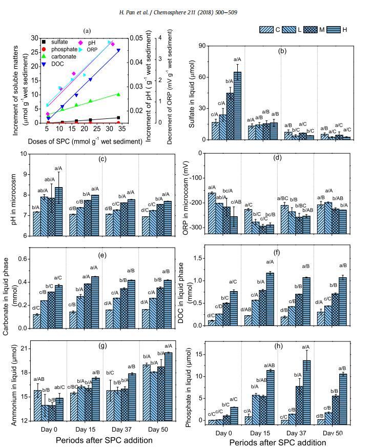 為了研究添加SPC對微環(huán)境的瞬時影響,在添加SPC劑量后3小時,測試環(huán)境變量,包括pH、ORP和溶解物質。圖1a顯示硫酸鹽、碳酸鹽、DOC和pH的量隨著SPC劑量的增加而增加,且增量與SPC劑量呈線性相關。相反,ORP降低,ORP降低與SPC劑量呈線性相關。
