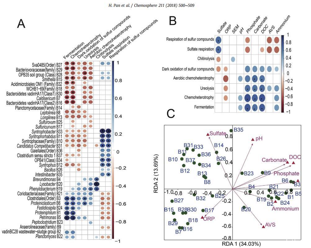 圖4A顯示了八個功能群與37個屬之間的顯著spearman相關性(p<0.05)。一方面,能夠發(fā)酵和化學異養(yǎng)的微生物與Petrimonas屬、嗜蛋白菌屬、苛孢霉屬、破蛋白菌屬和未培養(yǎng)的細菌呈梭狀芽孢桿菌的順序呈強正相關(系數(shù)>0.6)。能夠解脲的微生物與蛋白碎屑菌和梭菌的順序呈強正相關。此外,能夠進行幾丁質分解的微生物與苯桿菌、溶桿菌和短桿菌密切正相關。此外,能夠進行硫酸鹽呼吸和硫化合物呼吸的微生物與聯(lián)營養(yǎng)菌、聯(lián)營養(yǎng)菌、聯(lián)營養(yǎng)菌和聯(lián)營養(yǎng)菌科細菌密切正相關。另一方面,能夠發(fā)酵和化學異養(yǎng)的微生物與Smithella、Caldisericum以及不同類別(B28和B30)和不同家族(B29、B32和B18)的細菌具有強烈的負相關。能夠解脲的微生物與史密氏菌和OPB35類細菌呈強烈的負相關。