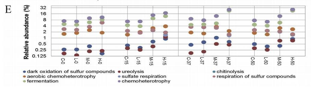 圖4B顯示了環(huán)境變量和功能組之間的顯著spearman相關性;表明大多數(shù)環(huán)境變量與功能組呈正相關。簡單地說,硫酸鹽主要與硫酸鹽呼吸和硫化物呼吸密切正相關。DOC、碳酸鹽和磷酸鹽與發(fā)酵、化學異養(yǎng)、尿素分解和需氧化學異養(yǎng)密切正相關。