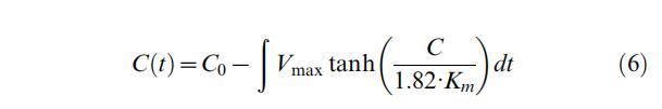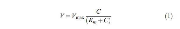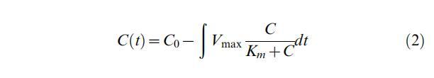 與使用Michaelis-Menten動力學類似,培養過程中氧濃度的時間演變符合以下方程式: