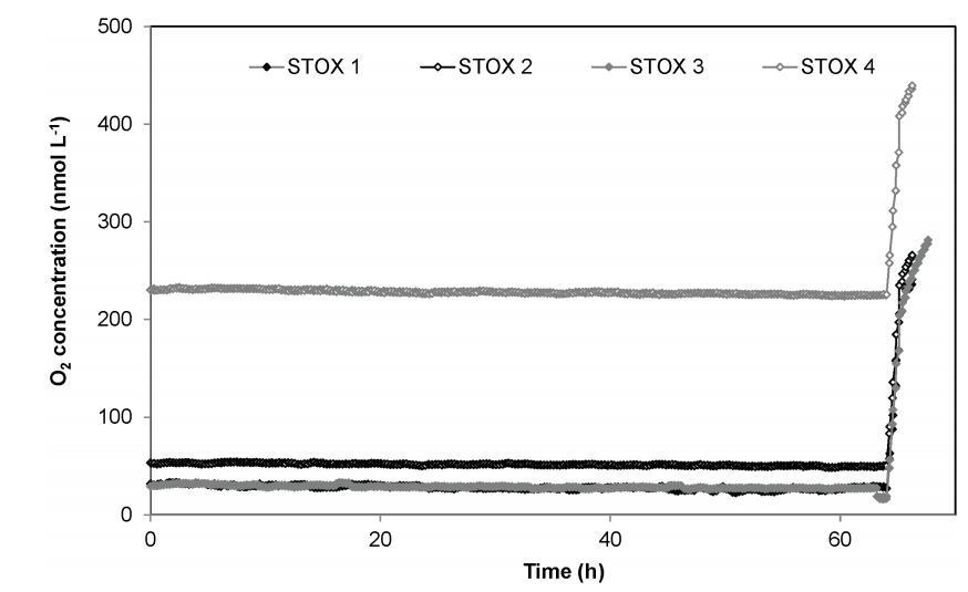 圖2。對照實驗的結果(實驗1)。顯示了具有不同氧濃度的四個不同重復。添加64 h 1 mL空氣,飽和0.05 M HCl,在毫質量水中,對應于244 nmol L-1 O2,用于傳感器校準。內政部:10.1371/期刊。波內。0105399.g002