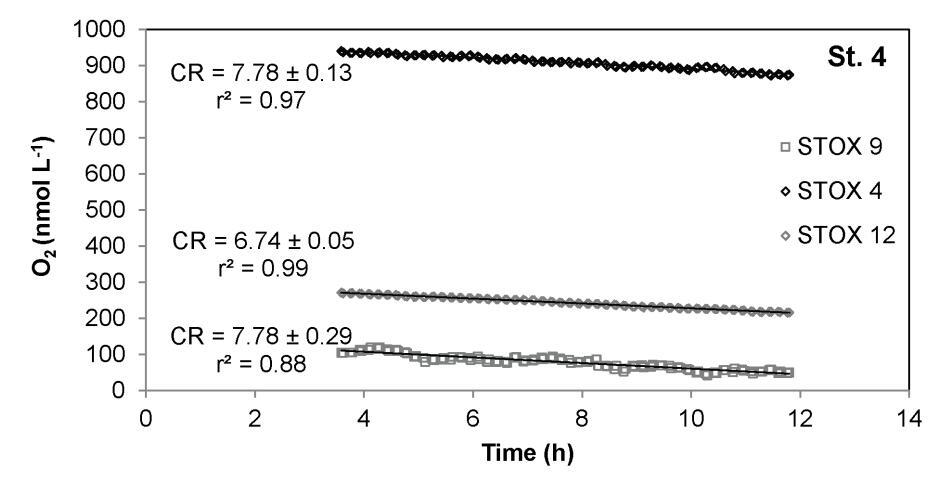 圖7。與海洋海水孵育的STOX傳感器中氧氣消耗的時間過程。2012年4月,在海洋站4號進行的船上實驗中,在3個重復瓶中氧氣消耗的時間過程。在3種不同DO水平下孵育的3個樣品的CR率相似(nmol-1 h-1)。CR率6標準誤差通過線性回歸確定,實驗的前三個小時由于傳感器信號上的噪聲而被丟棄。內政部:10.1371/期刊。波內。0105399.g007