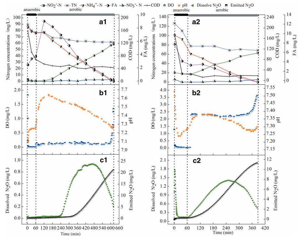 圖3。在兩個SBR循環(huán)中,含較高氨氮(240 mg/L)的氮化合物和控制參數的變化:(a1、b1和c1)是ASSBR中的COD、氮化合物、pH、DO和N2O;(a2、b2和c2)是SBBR中的COD、N-化合物、pH、DO和N2O。ASSBR,活性污泥序批式反應器。