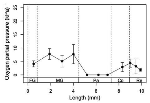 圖2。臺灣褐飛虱腸道系統(tǒng)的軸向氧分布。氧氣數(shù)據(jù)記錄在一個腸道隔室的中心。剖面圖上的每個點代表五次單獨測量的平均值±SE。